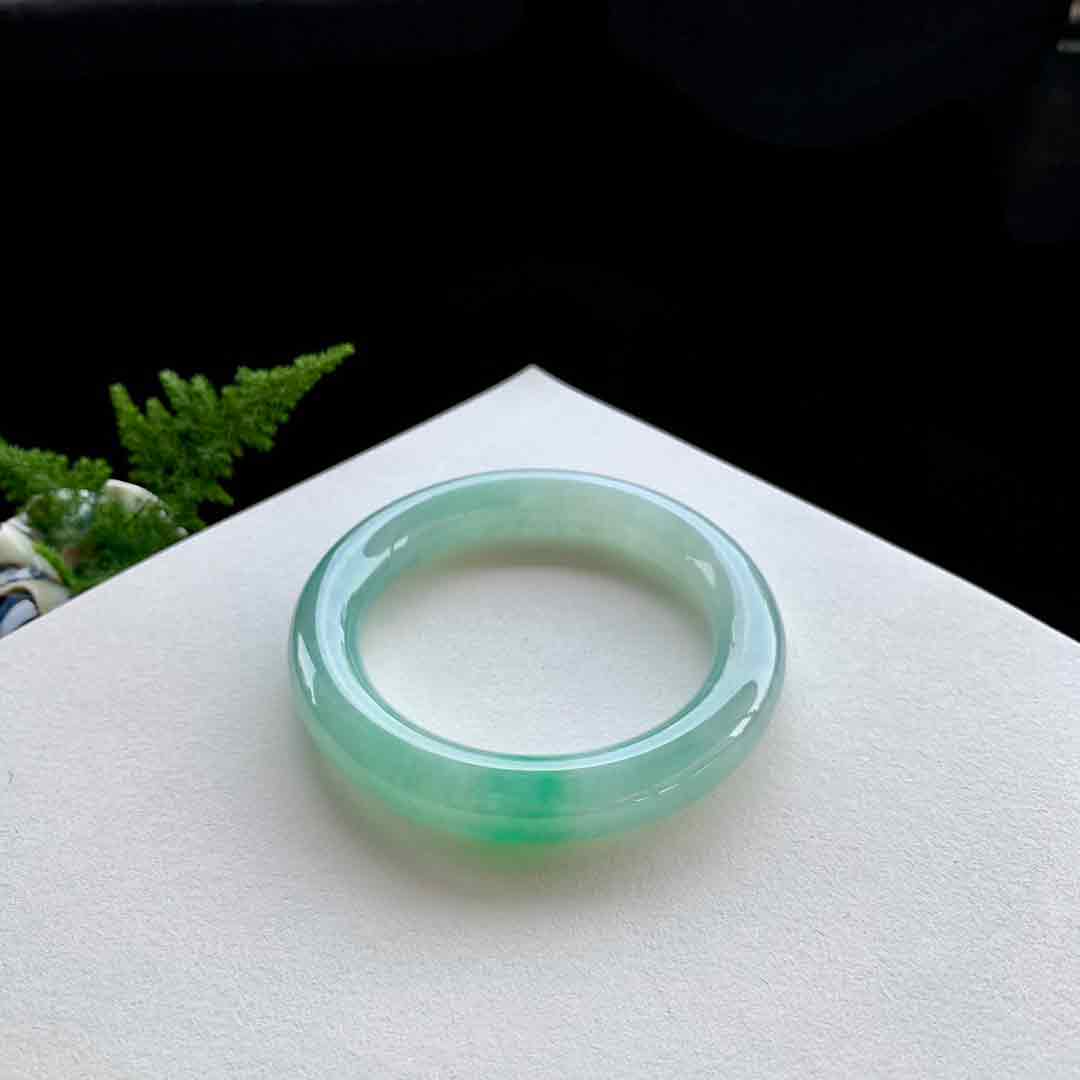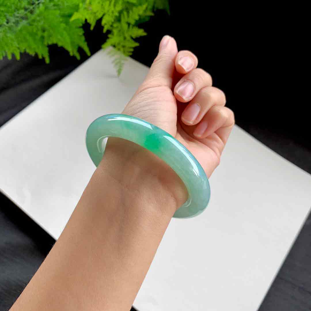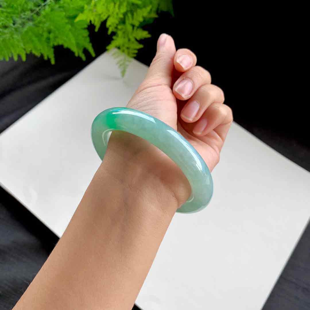 【手镯】圆条58 59 【圈口】58.3-12.2-11.7 【价格】96万 【编码】32711ZYW 【描述】阳绿,水润,种老,无纹裂
