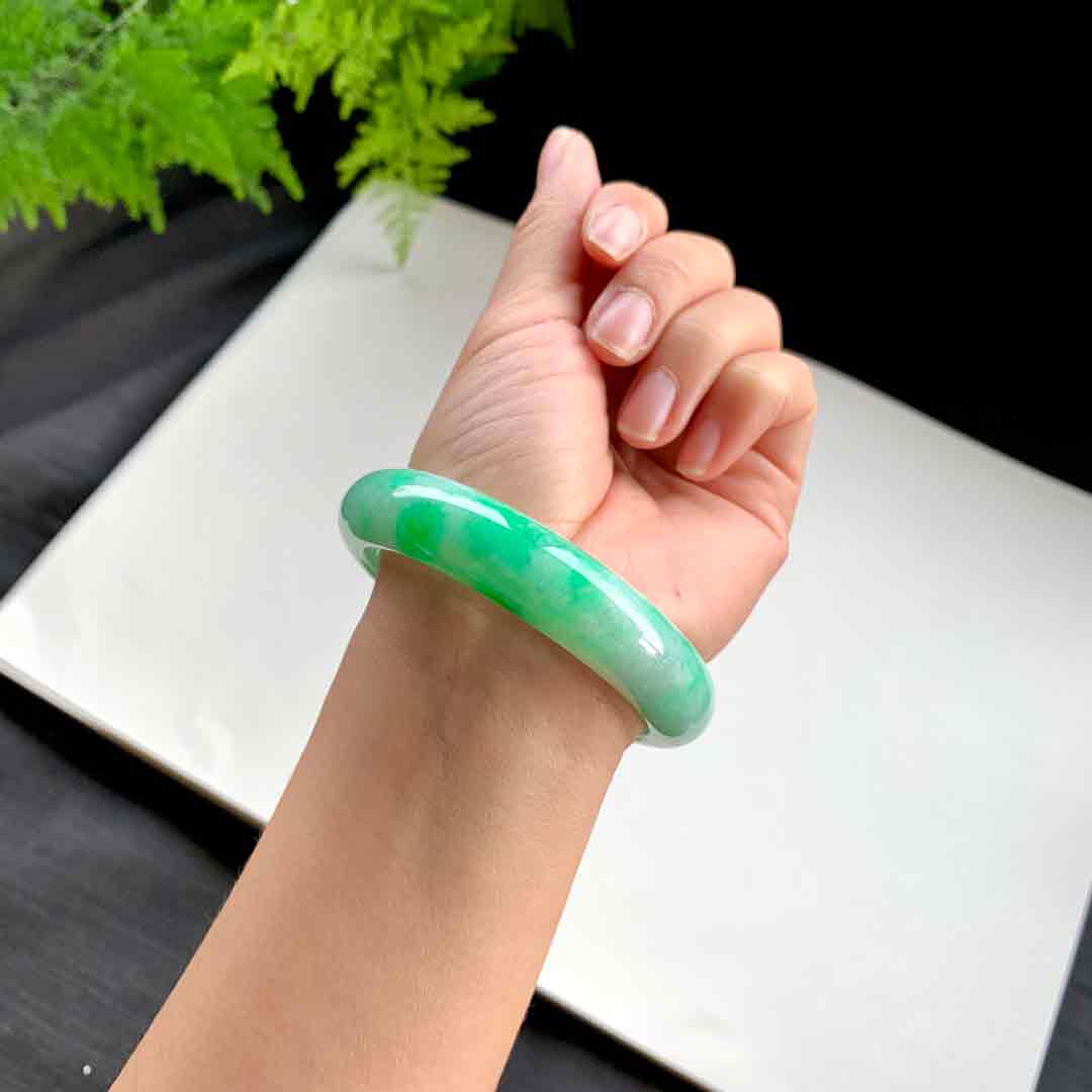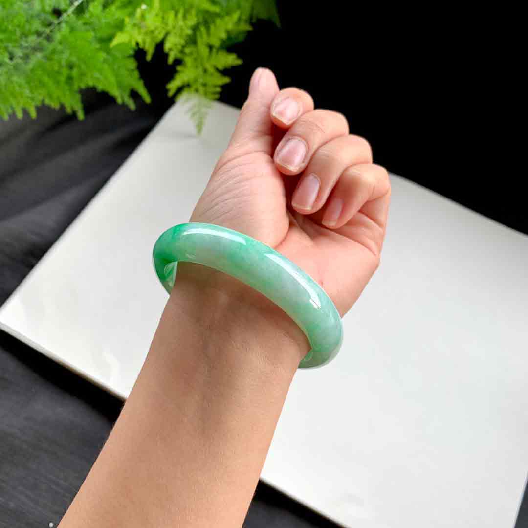 【手镯】正圈56 57【圈口】56.8-13.6-8【价格】9万【编码】32781YZM【描述】辣绿,水润,种老,无纹裂