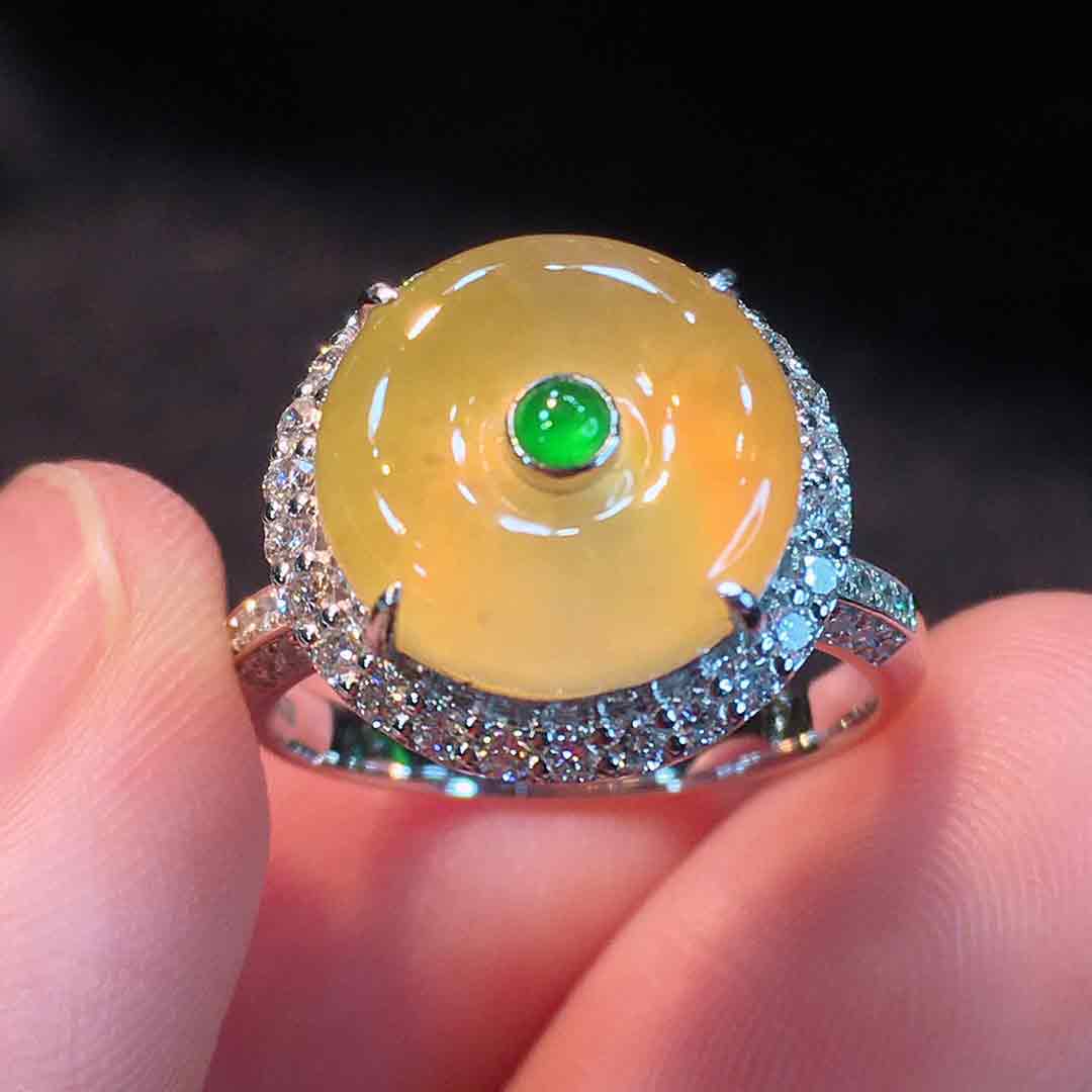 🍀冰种金翡平安扣戒指➕吊坠两用款 冰透水润,种老起胶,浓郁鸡油黄,美得让人沉醉。18K金伴钻豪华镶嵌